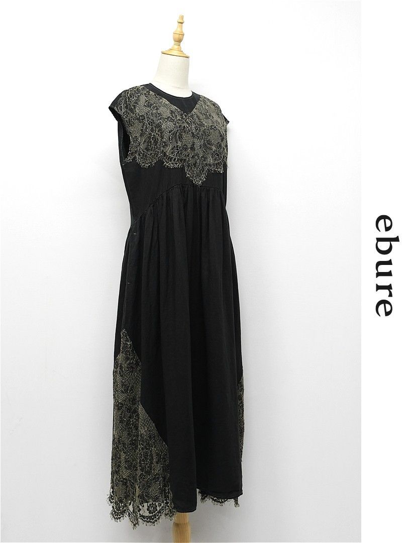 I487 ebure ロングワンピース ギャザー リネン 黒染め 36 春夏