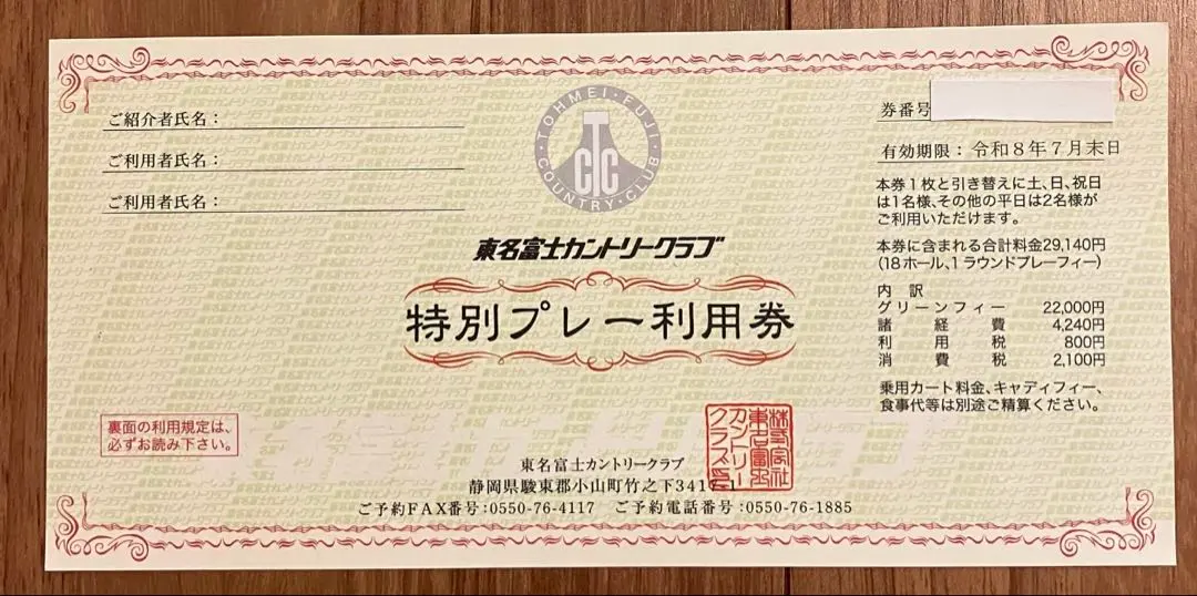 ゴルフ 東名富士カントリークラブ 特別プレー券 ゴルフ場 優待