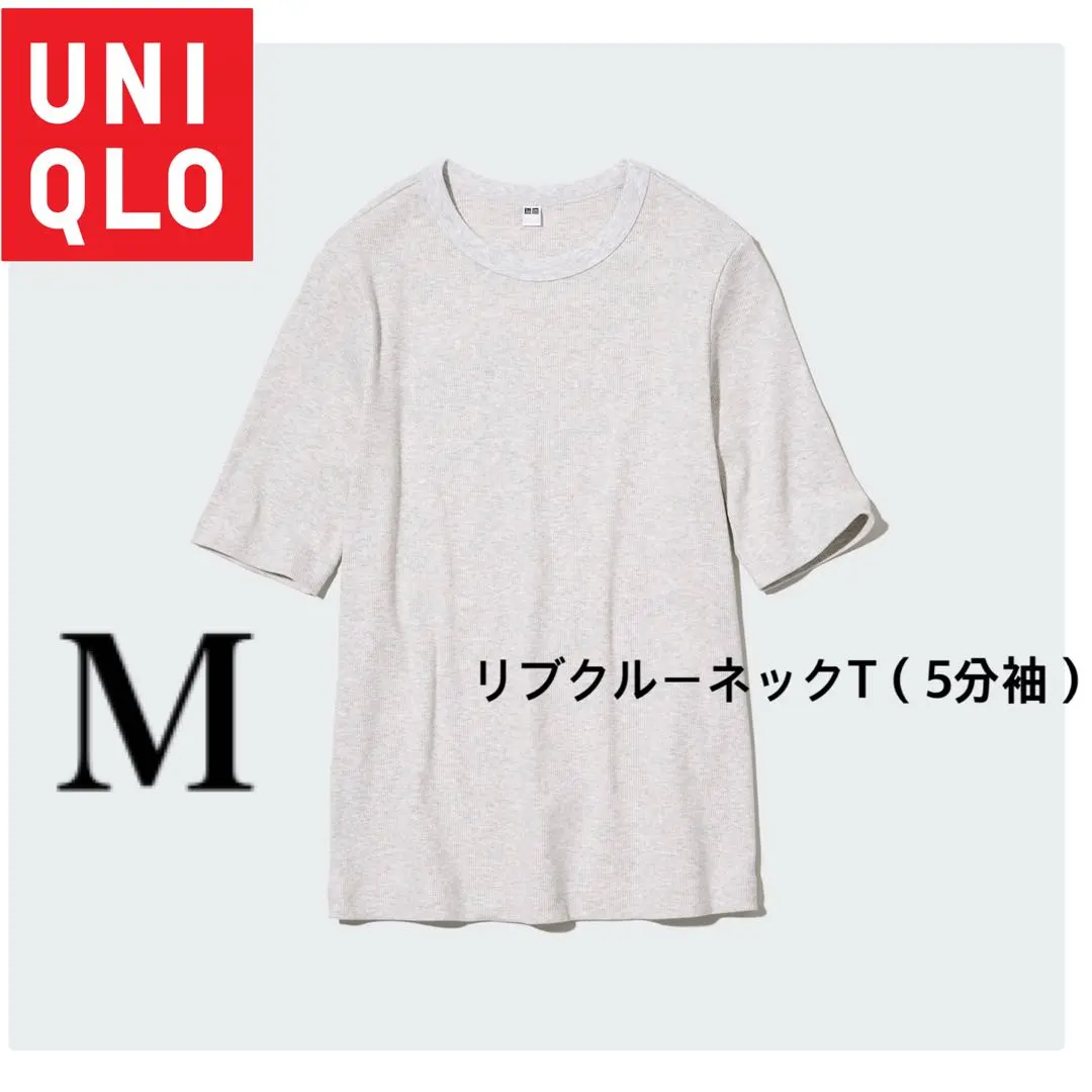 ユニクロ リブクルーネックT(5分袖) ライトグレー M Tシャツ 春夏服