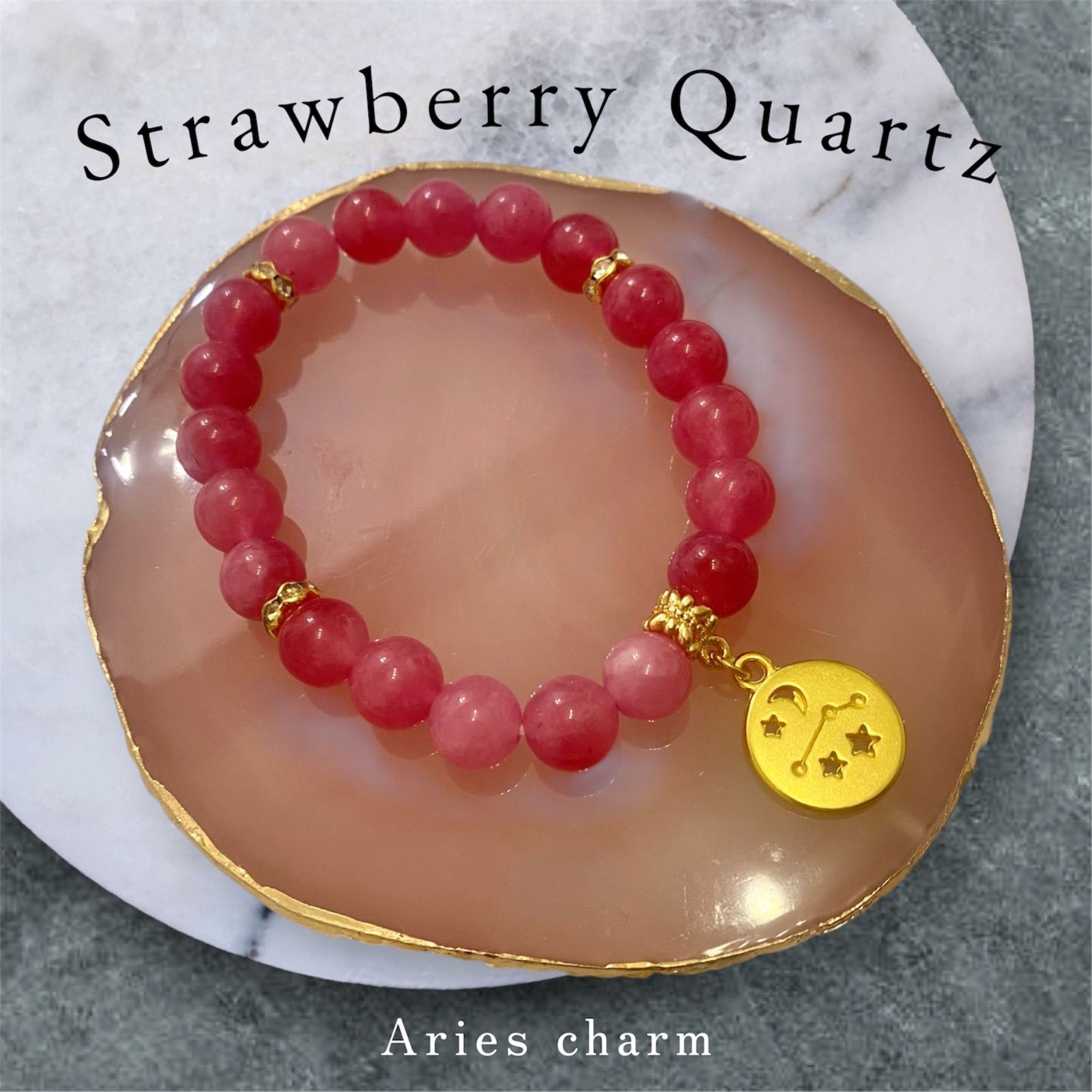 【天然石】ストロベリークォーツ × 星座チャーム パワーストーンブレスレット 開運 恋愛運 8mm