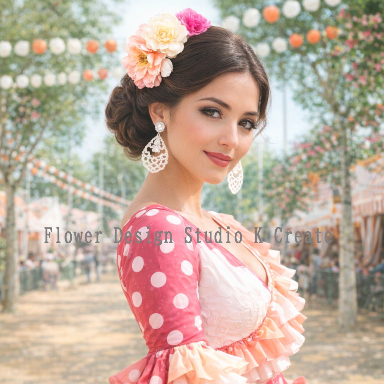 ピンクの薔薇とユーカリの実のリボンのコーム フラメンコ 髪飾り コーム ピンク