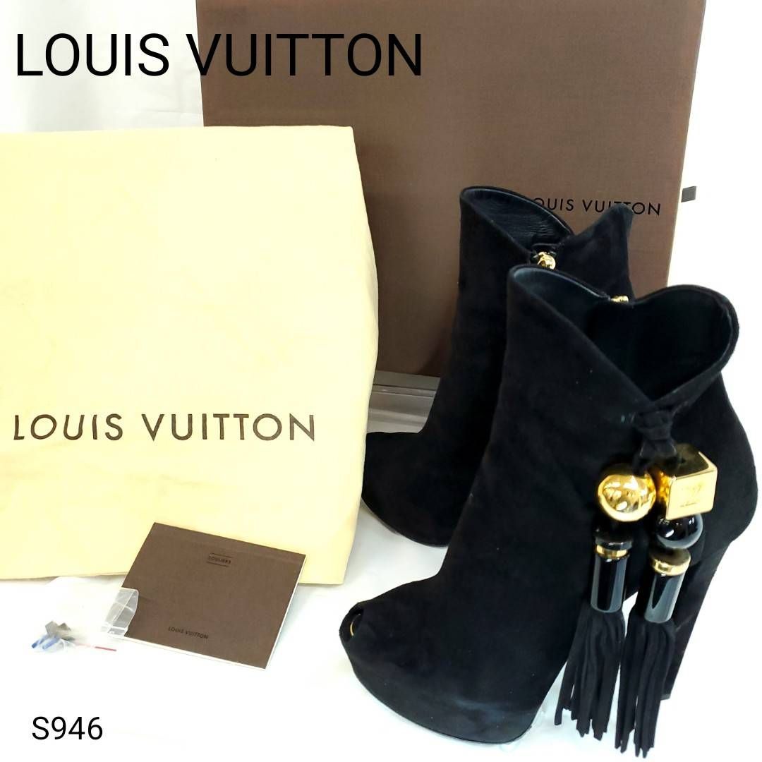 美品 ルイヴィトン ブーティ アンクルLVロゴ フリンジ付きオープントゥ 37