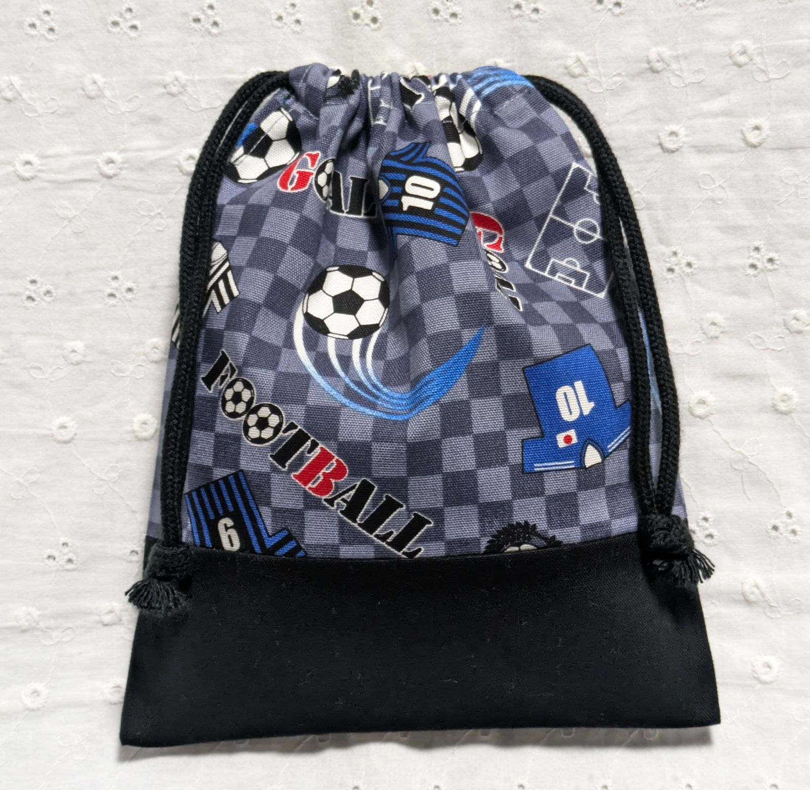 ハンドメイド、サッカーボール、シュート柄の給食袋、巾着袋、コップ入れ、グレー、黒