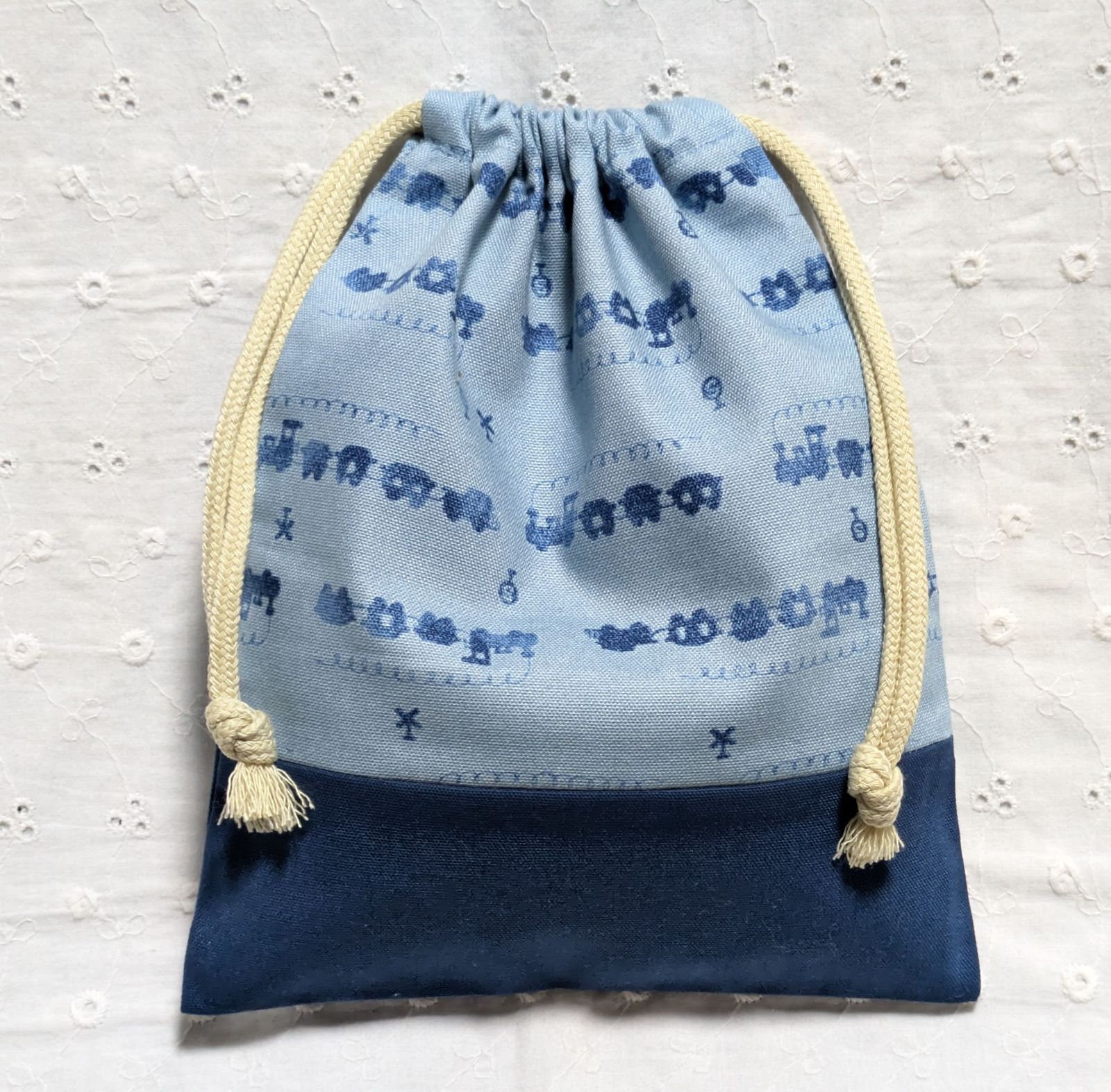 ハンドメイド、汽車柄の給食袋、巾着袋、コップ入れ、青