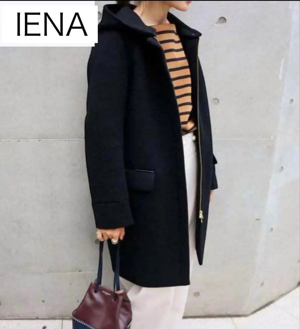 m様★IENA★定価4.7万黒 ノーカラーロングコート フード取外し可能
