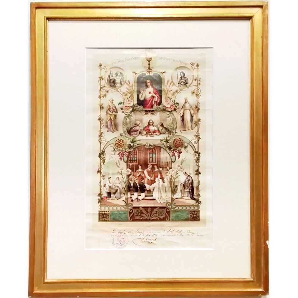 入信の秘跡の証明書 1925年 フランス アンティーク 洗礼 初聖体拝領 堅信 版画 カトリック キリスト教 額縁 ヴィンテージフレーム