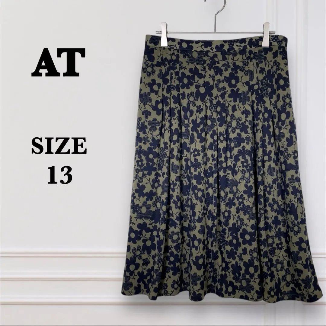 【AT】タグ付き 花柄 フレアスカート(L)タック入り ひざ丈 大きめ 日本製