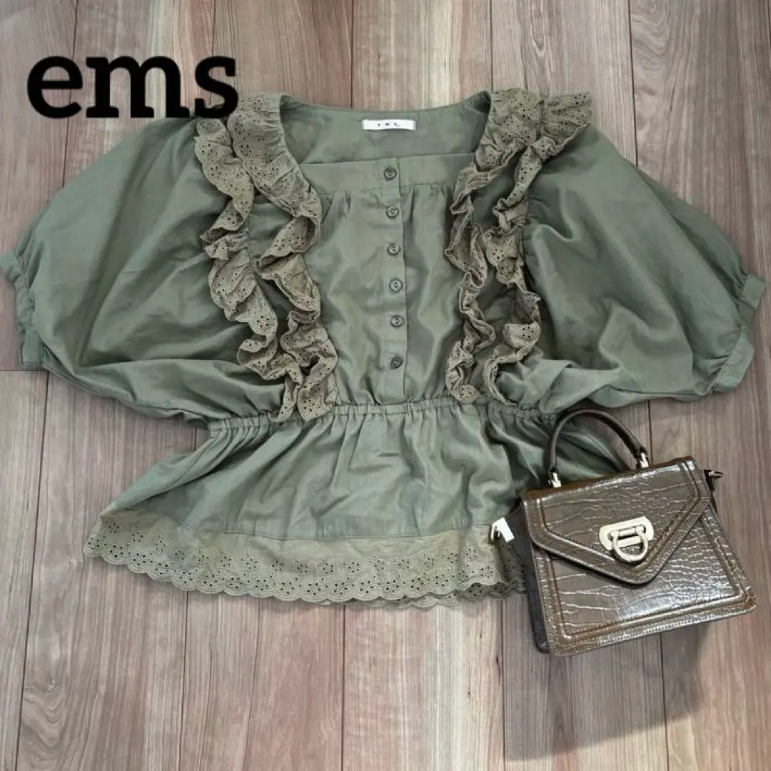 ems フリル付きオリーブグリーン半袖シャツ バルーンスリーブ フリル トップス