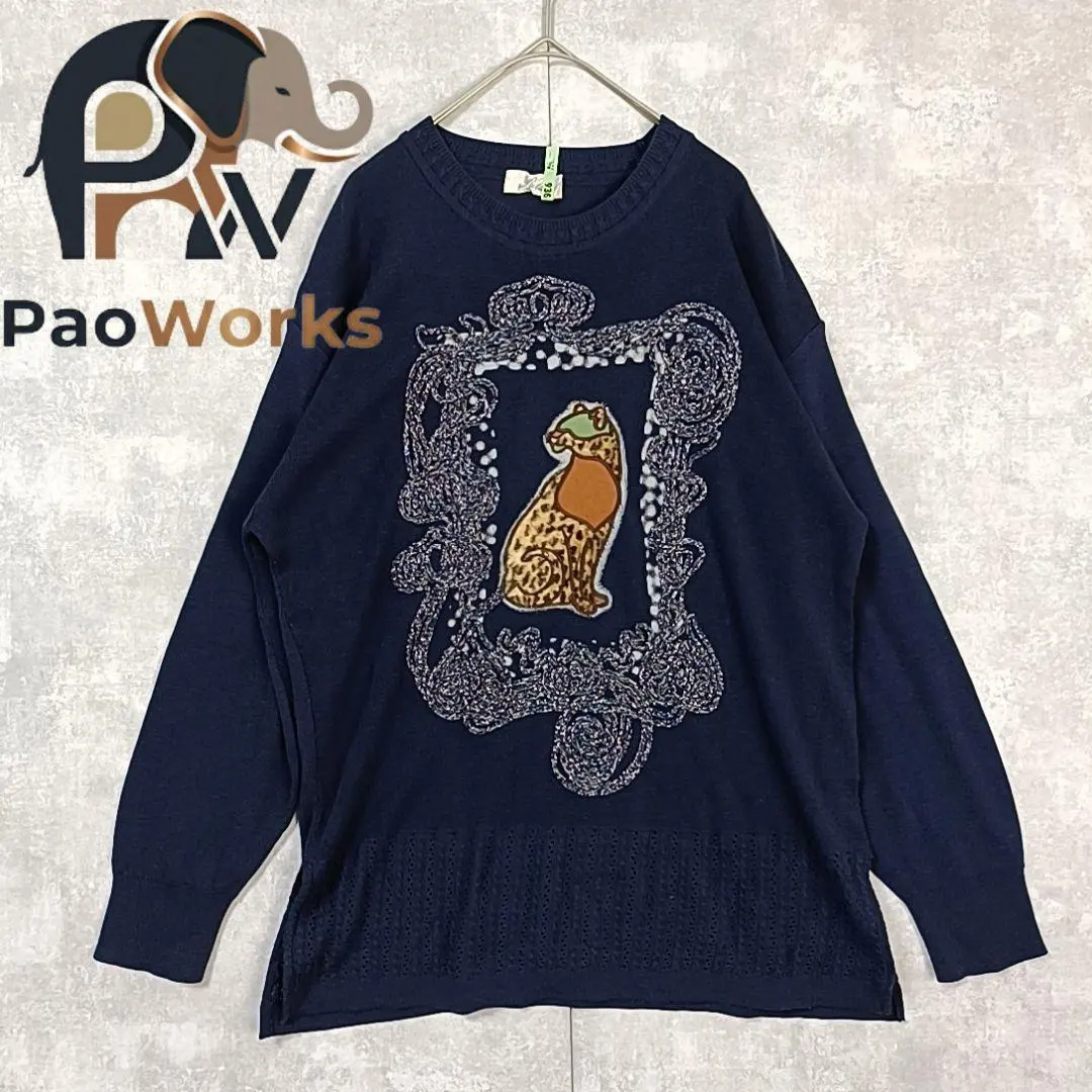 ニット セーター ひょう柄 アニマル柄 ビンテージ 古着 昭和レトロ ネイビー