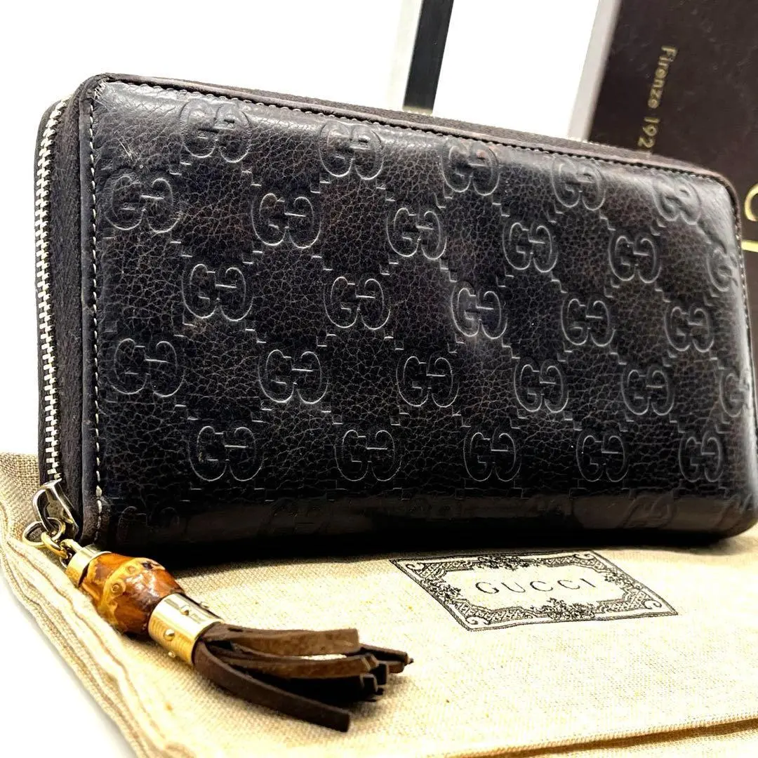 グッチ 長財布 ラウンドファスナー シマレザー レオパード バンブーチャーム 茶
