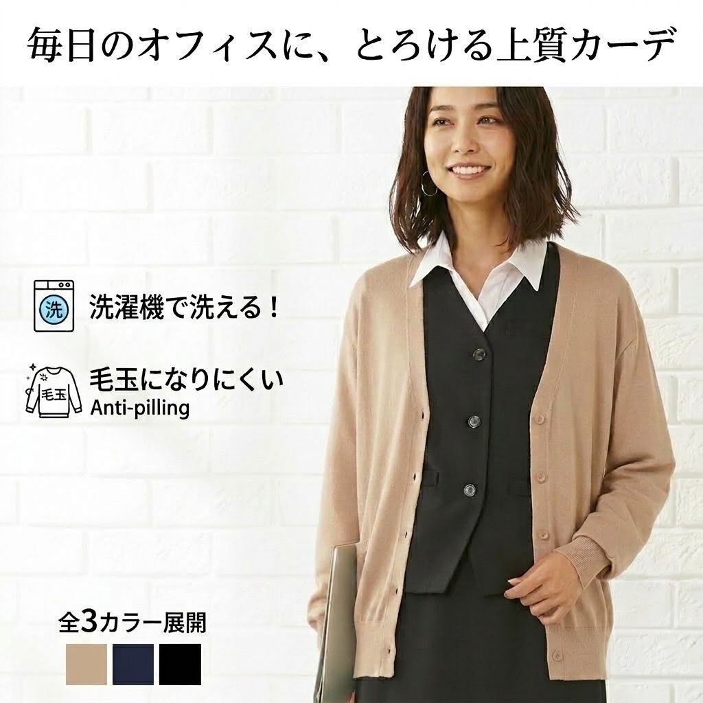 【新品・翌日配送】洗える毛玉になりにくい上質素材 ニットカーディガン M L ベージュ ネイビー紺 黒 春秋 ビジネス 仕事 オフィス 事務服 会社制服 看護師 介護士 ナース 受付 冷房避け ビスコースコットン