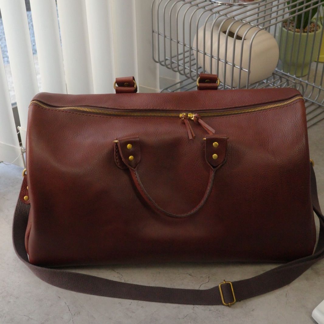 本革ボストンバッグ ダークブラウン リネア ヴァスカ ボックス 真鍮金具 大容量 旅行対応 ダッフルバッグ 旅行カバン