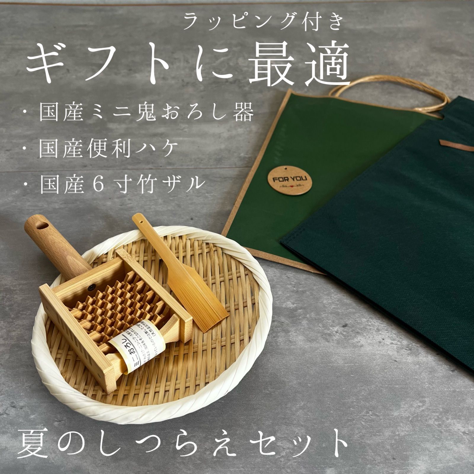 【国産 竹キッチンギフトセット】竹ザル18cm+鬼おろし+便利ハケ|ラッピング付き|夏のしつらえ・贈り物・和の台所道具セット 竹ザル 便利はけ 鬼おろし