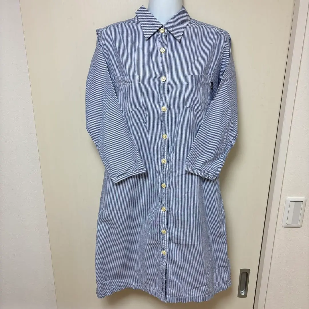 ミスティック ストライプ ブルー ホワイト シャツ ワンピース 膝丈 ボーダー