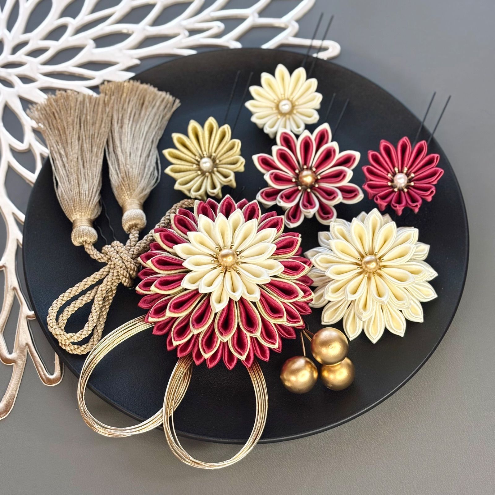 【新色/一点物】卒業式髪飾り 成人式髪飾り/ウエディング ヘッドパーツ 結婚式 色打掛 サテンつまみ細工 赤 アイボリー