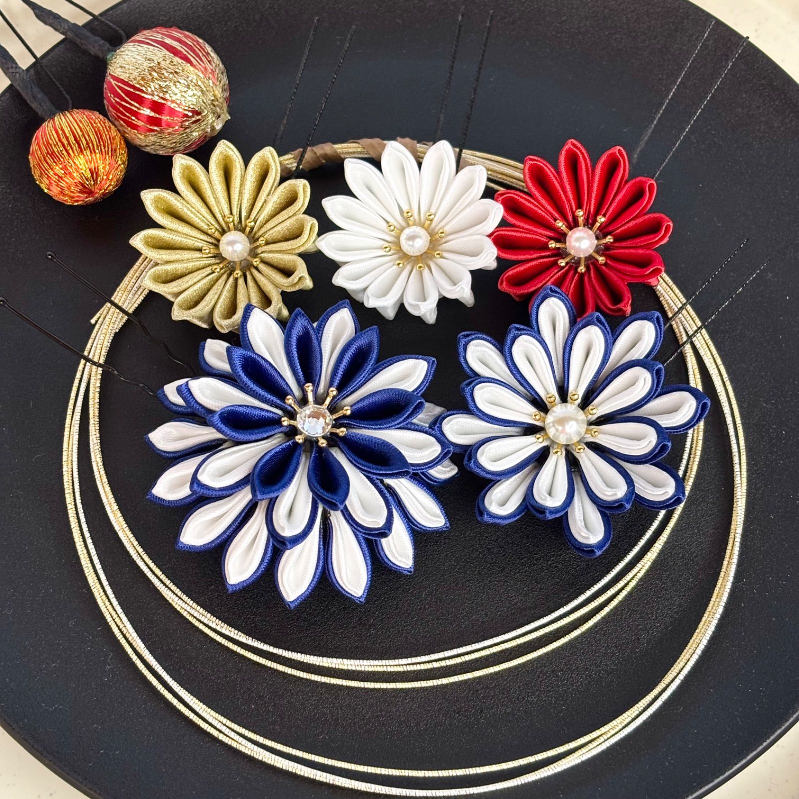 【特別価格】一点物/卒業式髪飾り 成人式髪飾り/ウエディング ヘッドパーツ 結婚式 色打掛 サテンつまみ細工 紺色