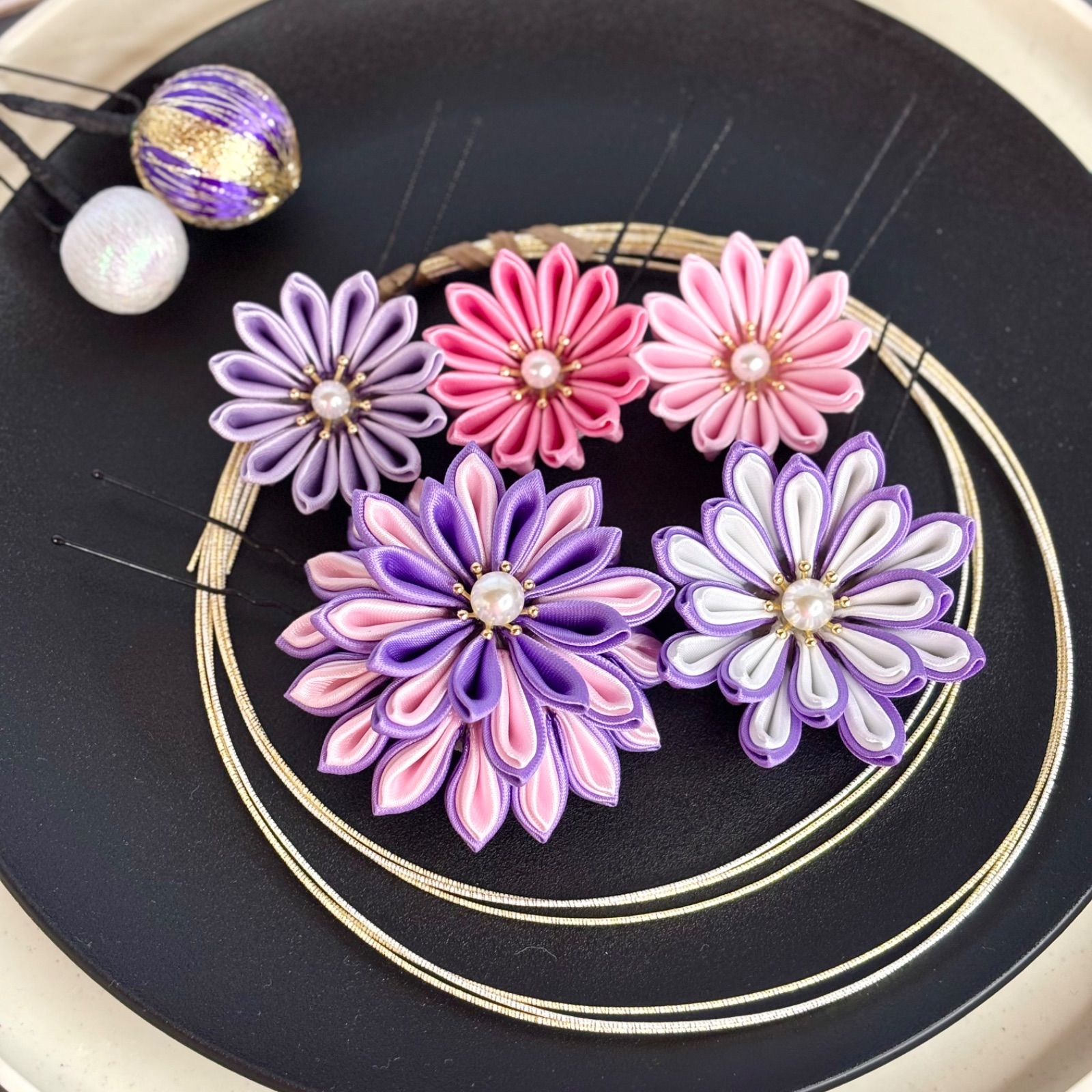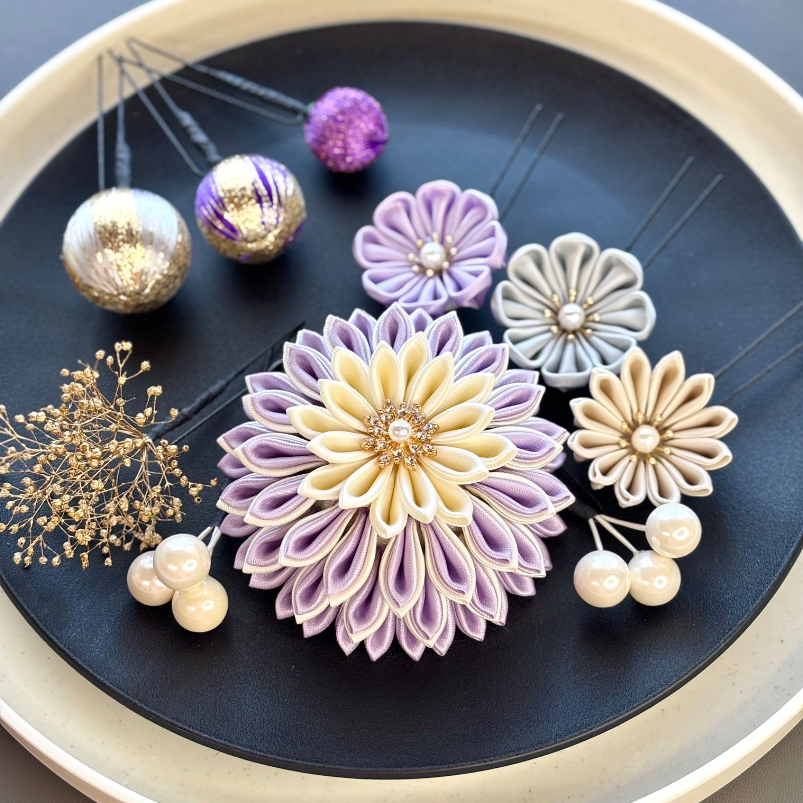 【新色/一点物】卒業式髪飾り 成人式髪飾り/ウエディング ヘッドパーツ 結婚式 色打掛 サテンつまみ細工 紫 アイボリー