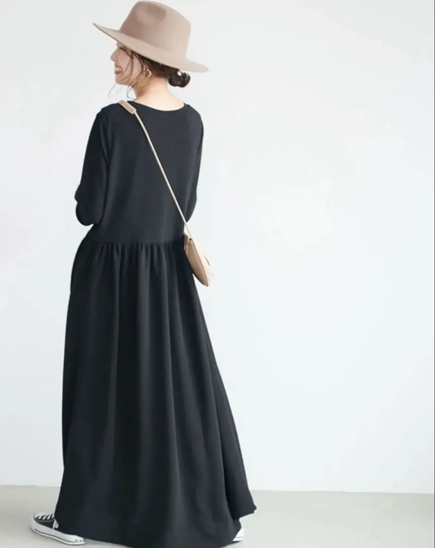 エンボス加工 ブラック マキシ丈 ロングワンピース ONE SIZE