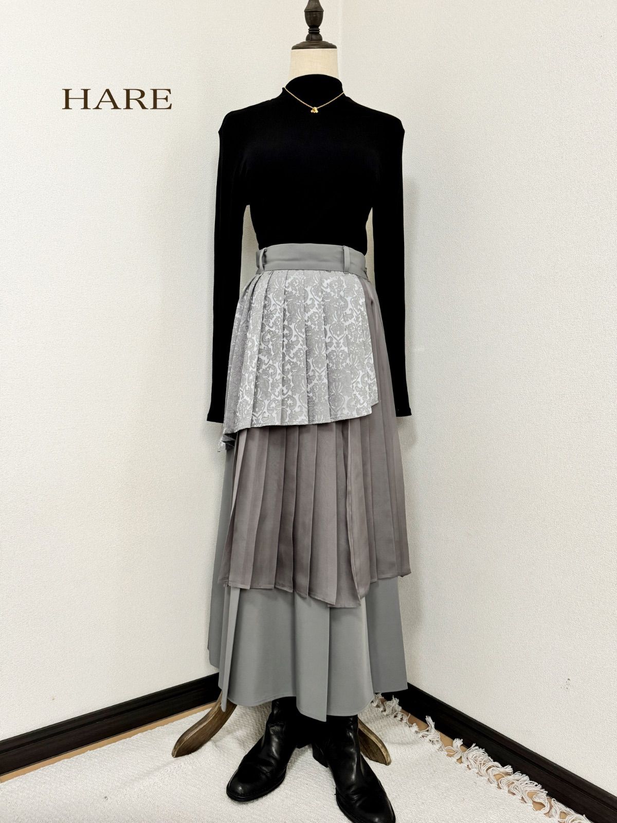 HARE アシメミックスプリーツスカート HARE ハレ プリーツスカート ロング マキシスカート グレー