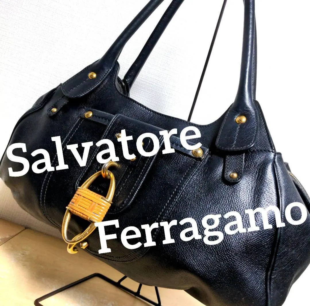 cg8. Salvatore Ferragamo ボストンバッグ 黒 南京錠