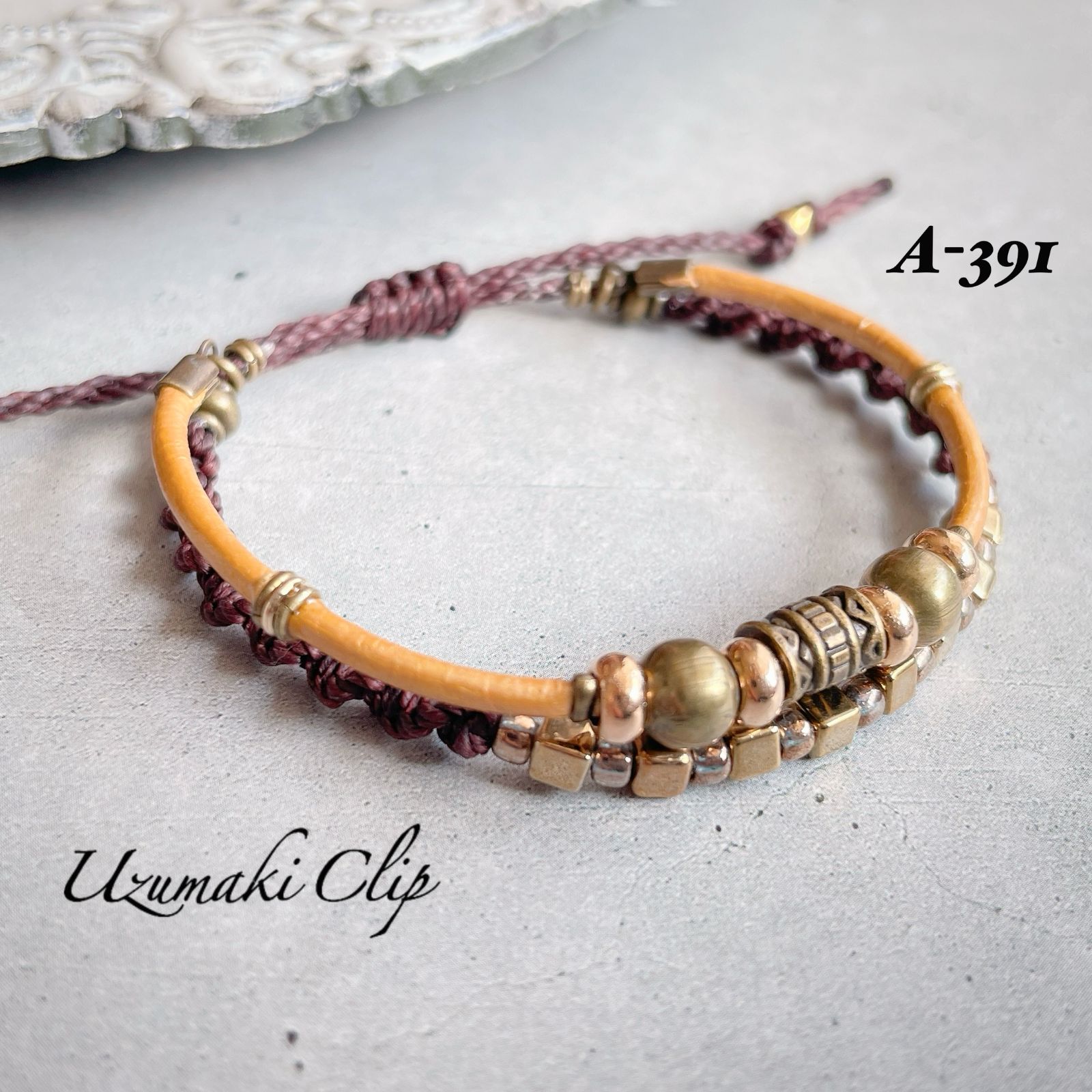 パイプモチーフの本革とワックスコードの2連ブレスレット【結灯〜ゆいあかり〜】B-②