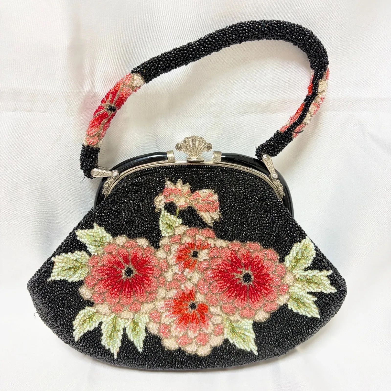 ビーズバッグ 和装バッグ フォーマル 黒ビーズ 赤 花柄 和装小物