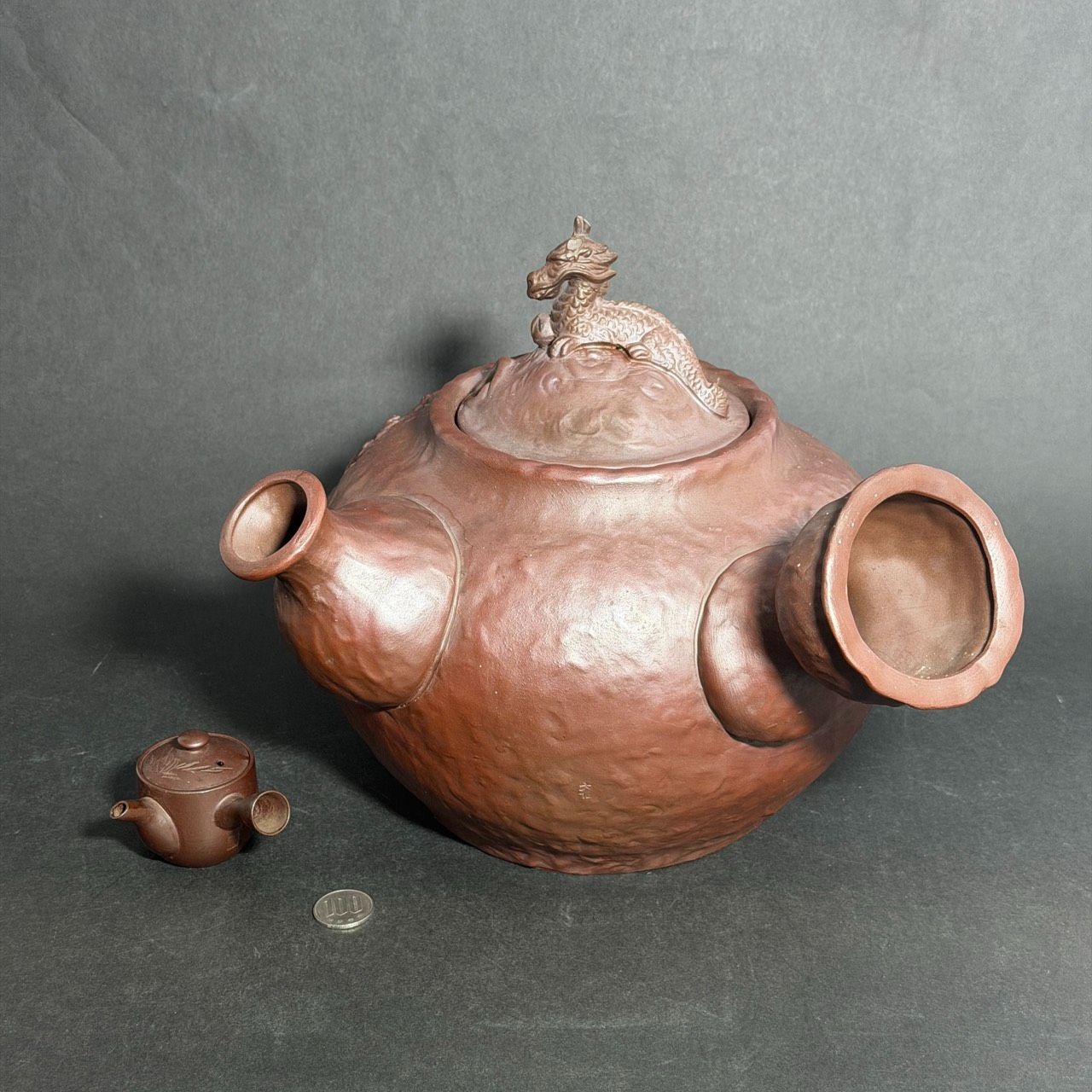 万古焼 特大急須 常滑焼 極小急須 雀の巣 龍 山水画 精密彫刻 珍品 置物 茶道具