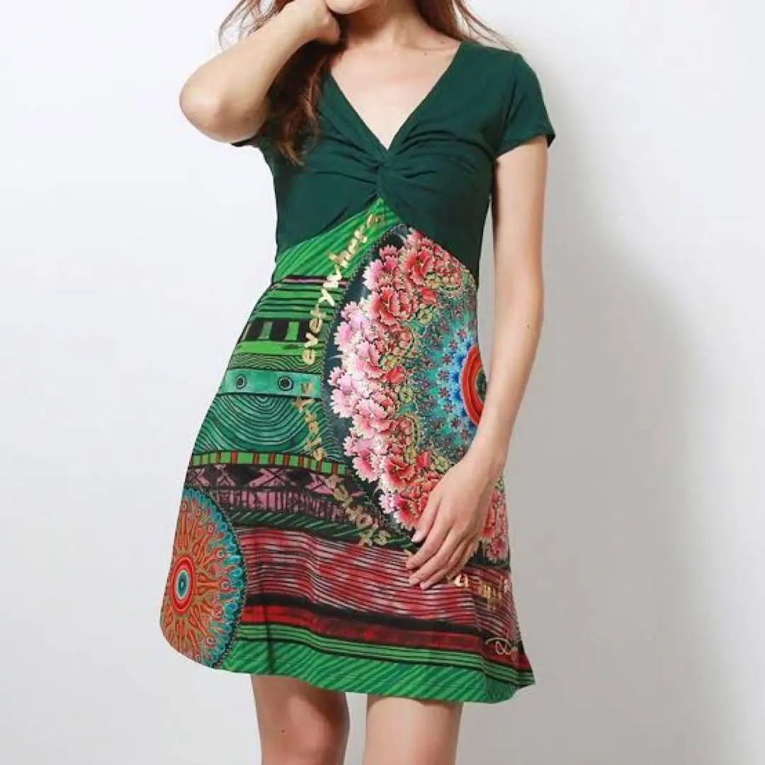 デシグアル ワンピース 緑 グリーン 半袖 Vネック 派手 曼荼羅