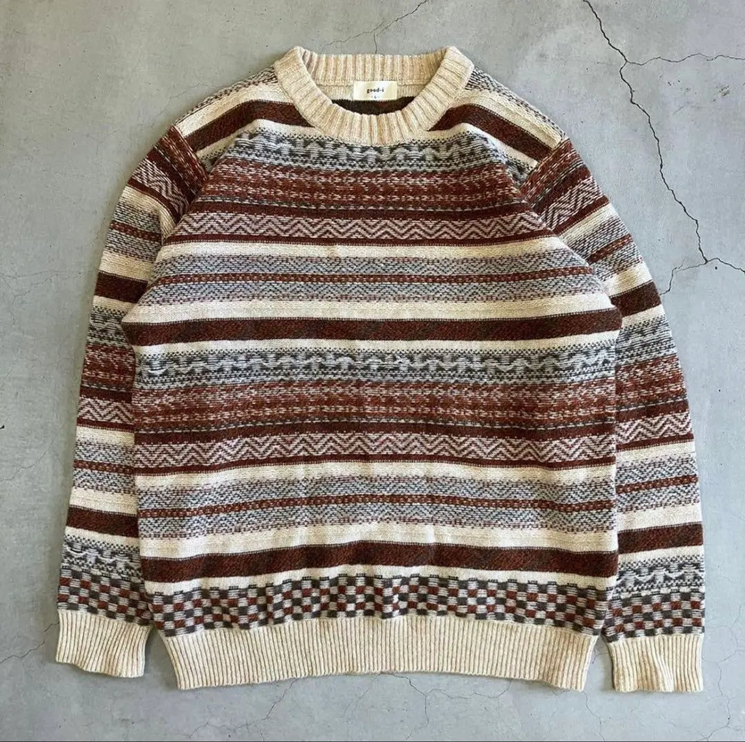 幾何学模様ニットセーター ブラウンクリーム