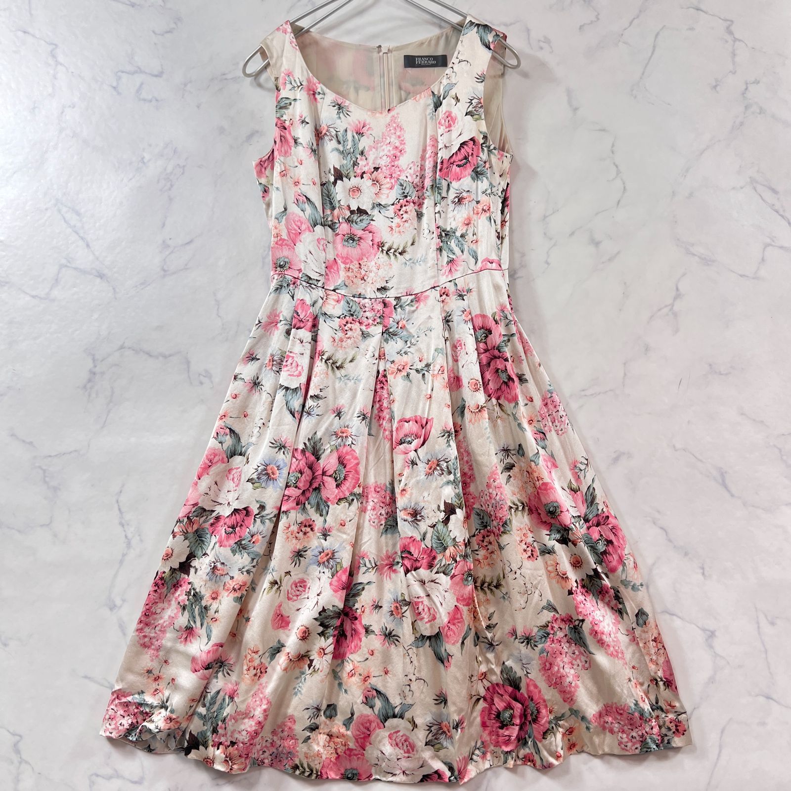 M 美品 シルク100% フランコフェラーロ 花柄ワンピース リボンベルト ノースリーブ Aライン ロング ピンク FRANCO FERRARO レディース B2180
