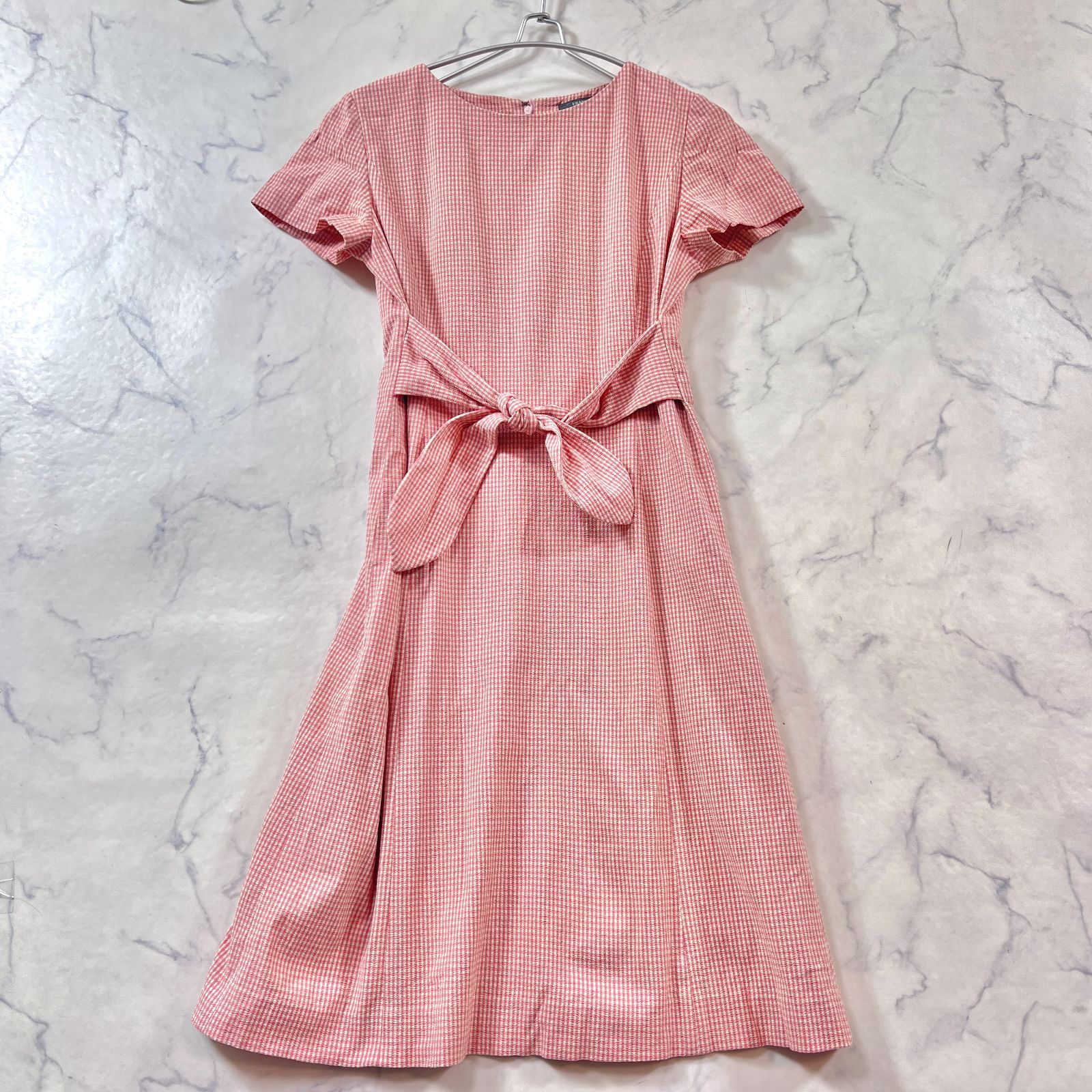 M 美品 フランコフェラーロ ギンガムチェック柄ワンピース リボンベルト 半袖 Aライン ロング ストレッチ ピンク FRANCO FERRARO レディース B2177