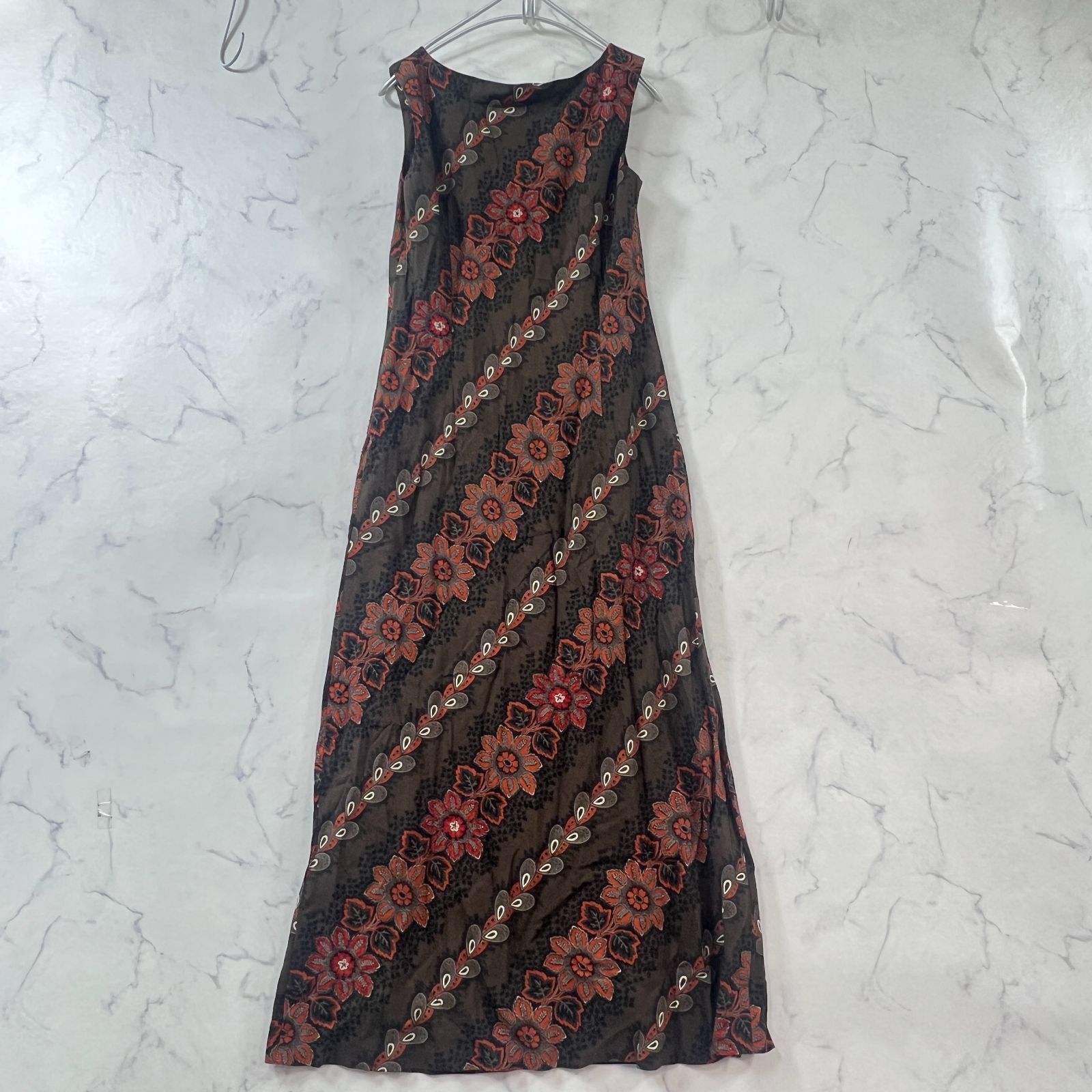 【L】極美品 シルクリネン ローラアシュレイ ワンピース 刺繍 ビーズ 花柄 リゾートワンピース ロング ノースリーブ 茶色 ブラウン LAURA ASHLEY レディース B2282