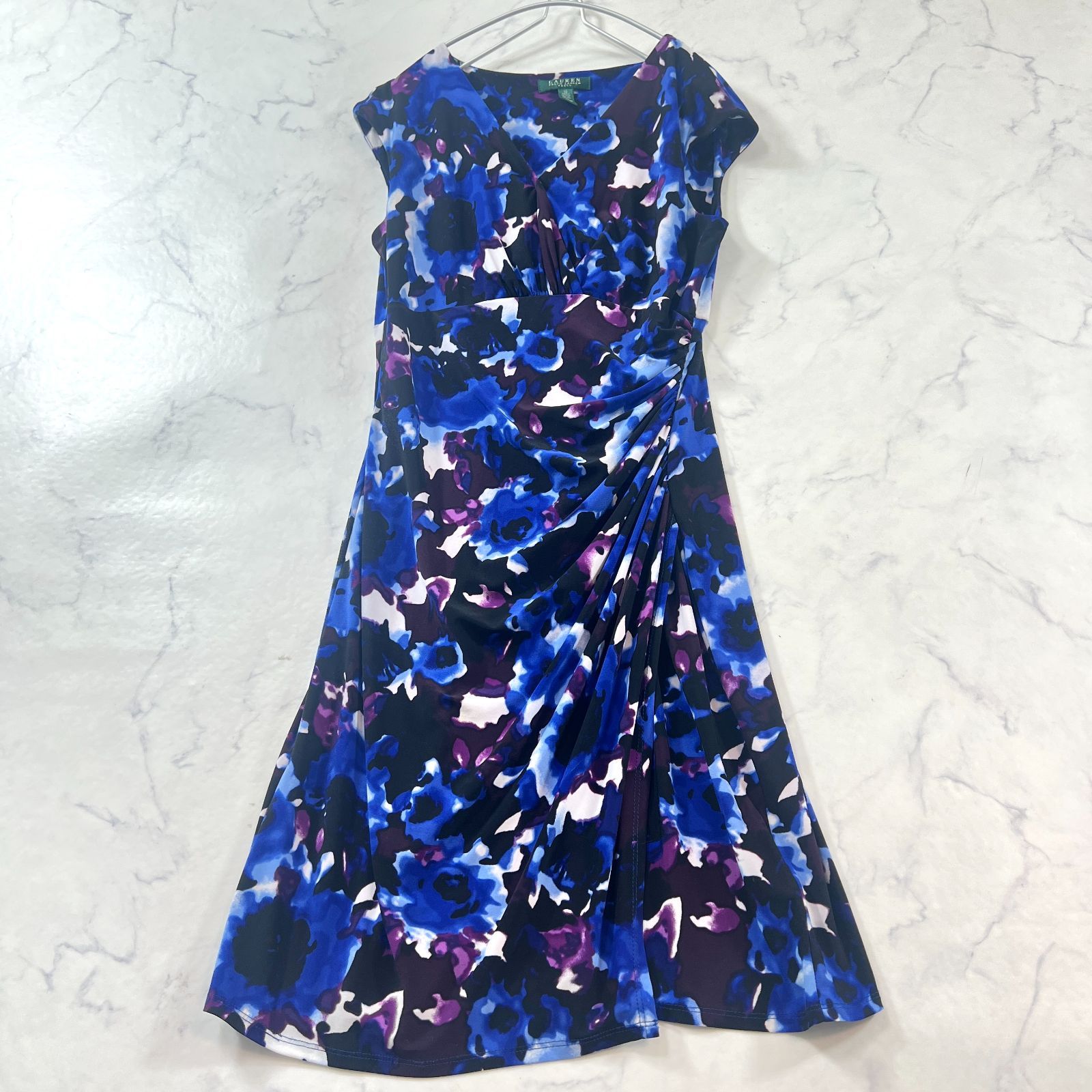 ローレンラルフローレン 花柄ワンピース ロング カシュクール ストレッチ ドレス 半袖 ブルー LAUREN RALPH レディースL B2289