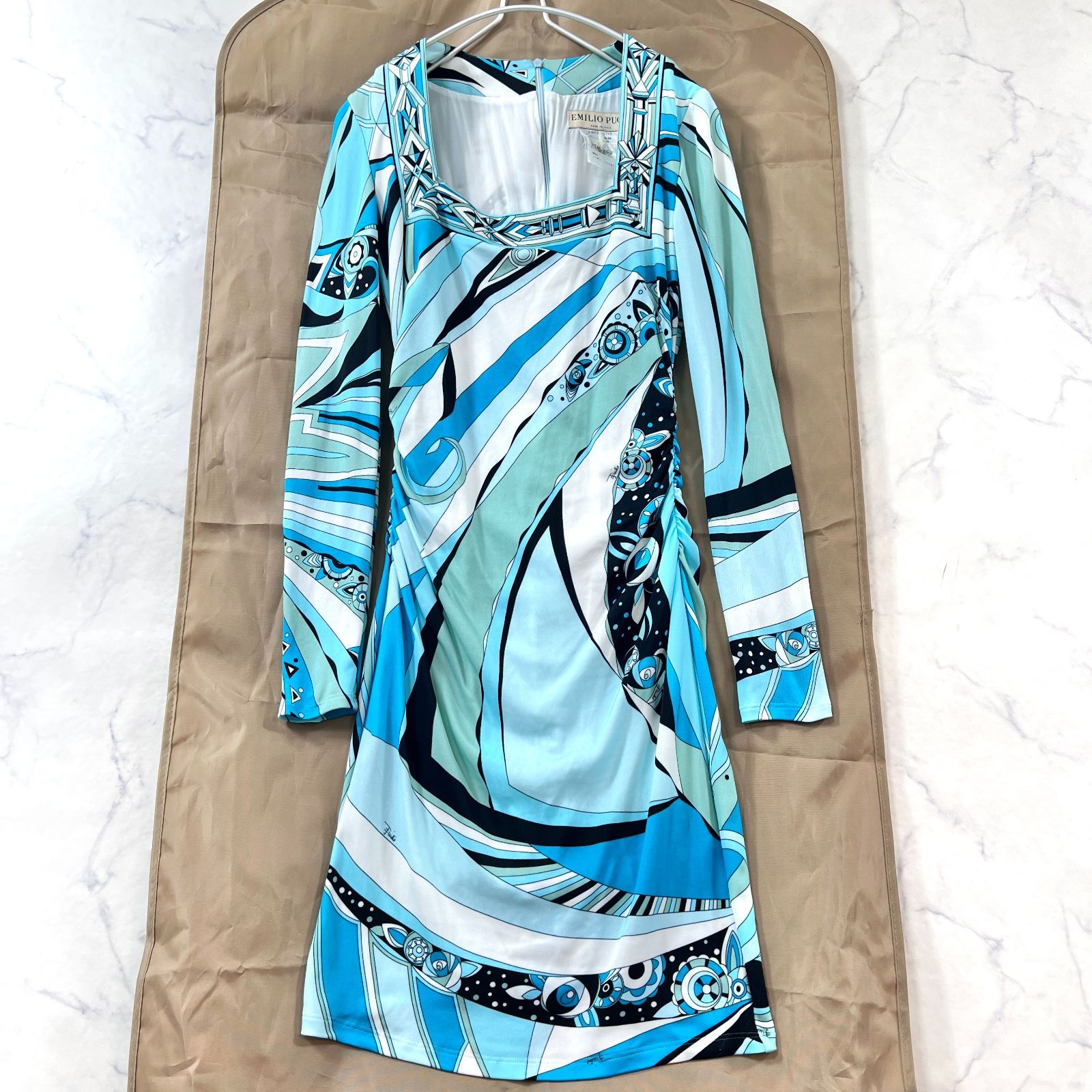極美品 エミリオプッチ ワンピース レーヨン ストレッチ ロング 長袖 通年 水色 ブルー EMILIO PUCCI レディースS B2299