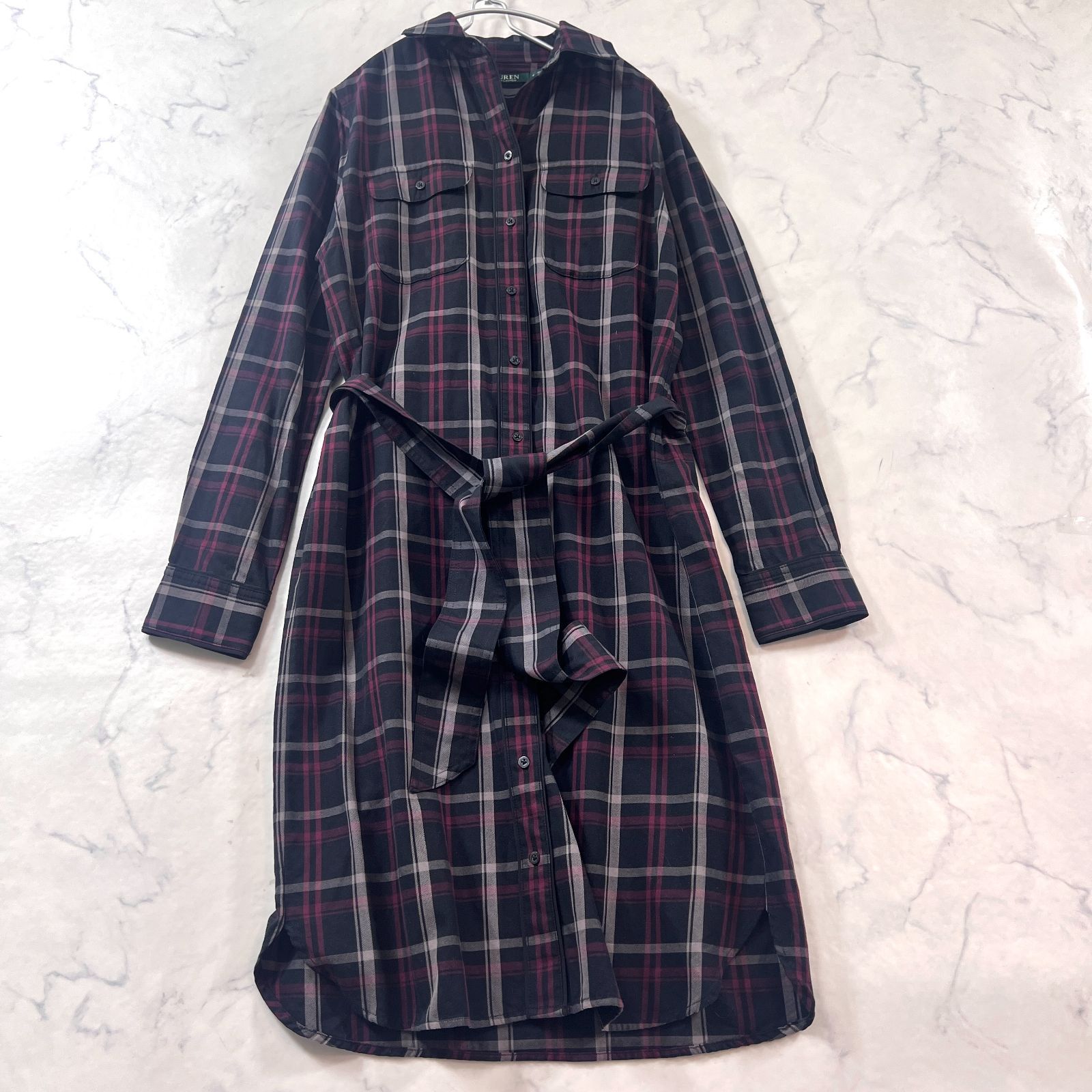 L~XL 極美品 ローレンラルフローレン シャツワンピース ロング チェック柄 ベルト 長袖 黒 ブラック LAUREN RALPH レディース B2280