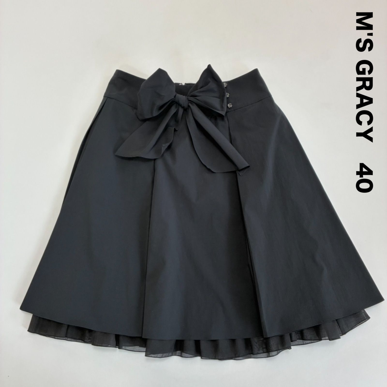 M'S GRACY エムズグレイシー☆取り外し可能な大きなリボン カメリア お花ボタン シアーチュールレイヤードスカート 40 ブラック