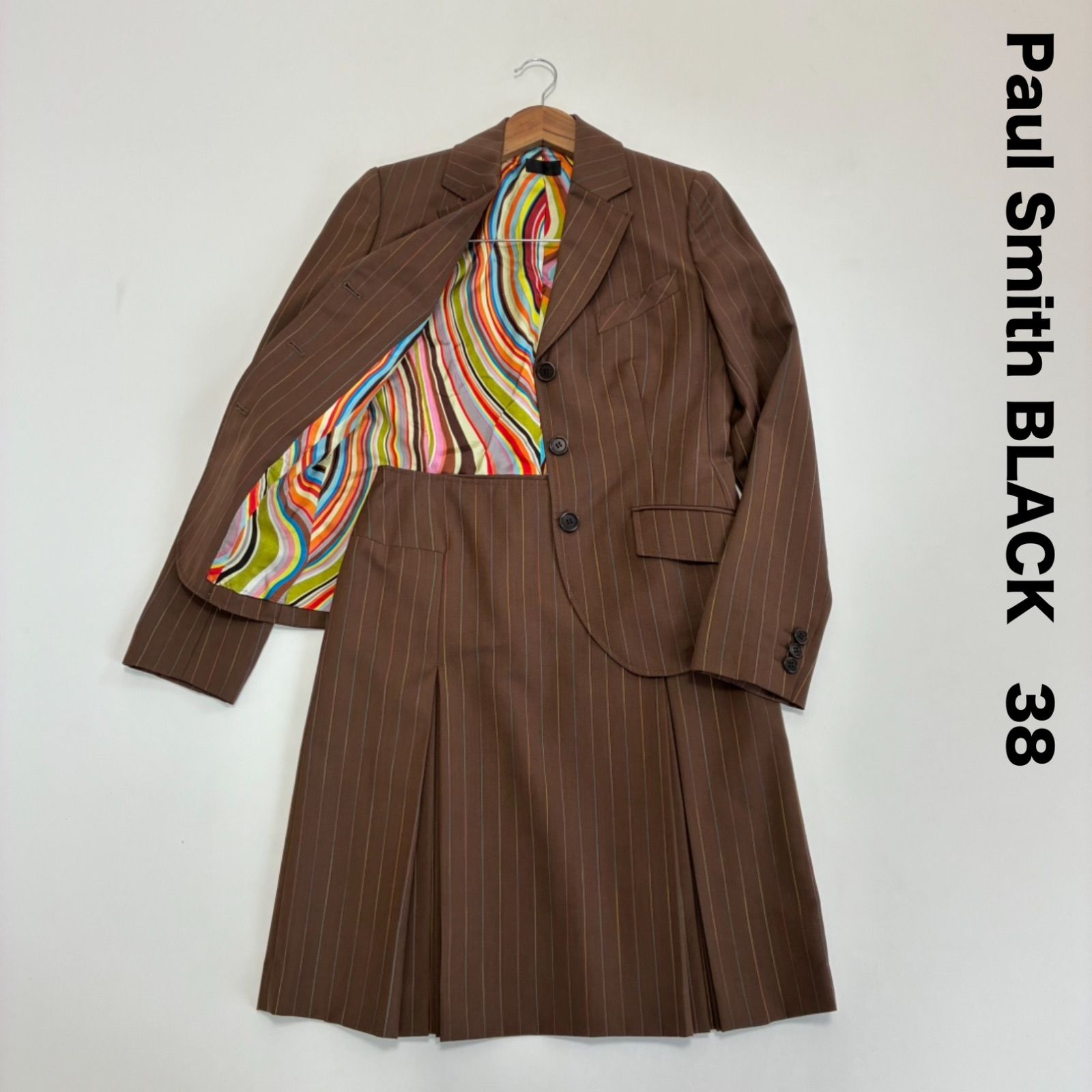 Paul Smith BLACK ポールスミス☆カラフルピンストライプボックススカートスーツ テーラードジャケット ブラウン 裏地幾何学柄