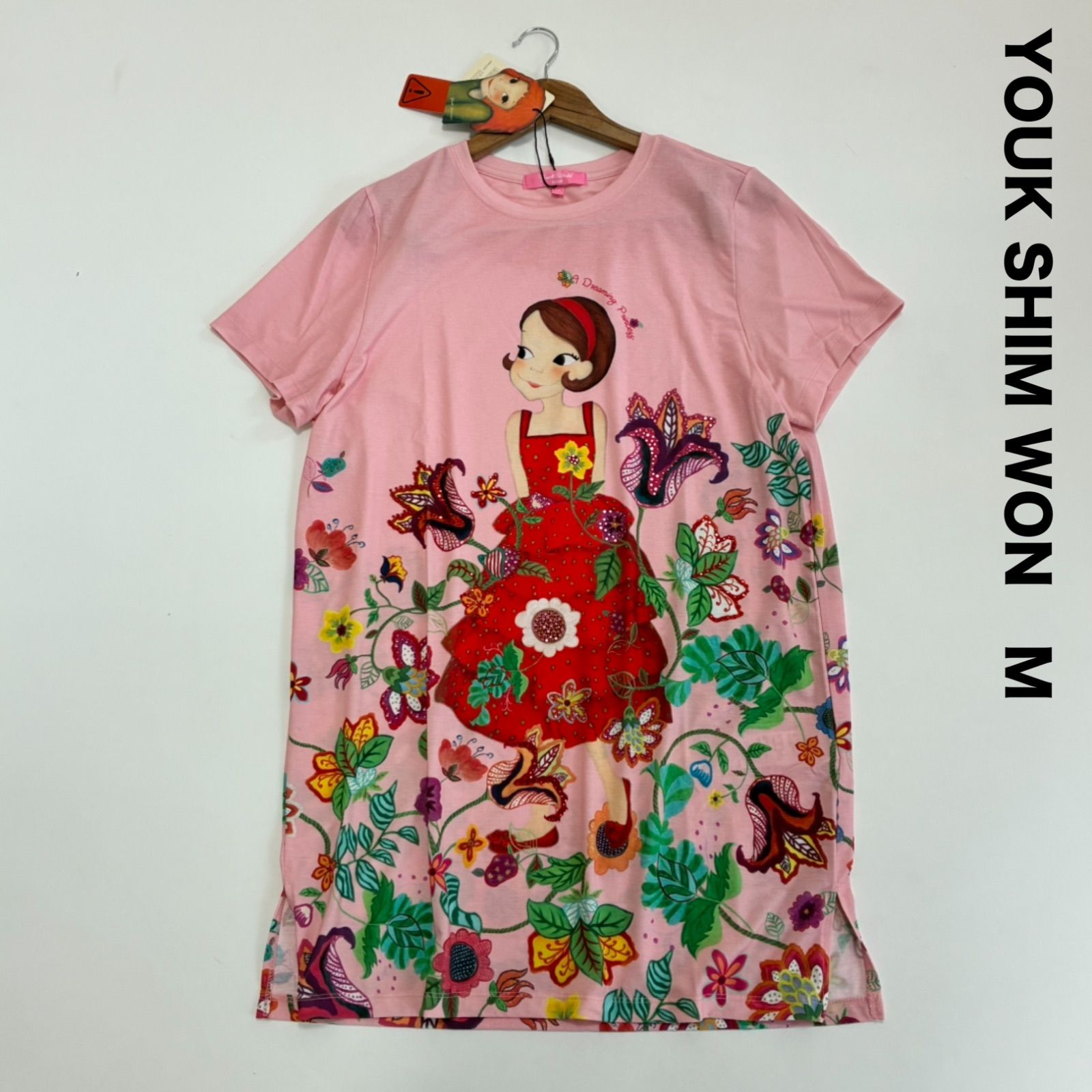 YOUK SHIM WON Youk Warld ユクシムウォン Tシャツワンピース M ピンク お花 ラインストーン
