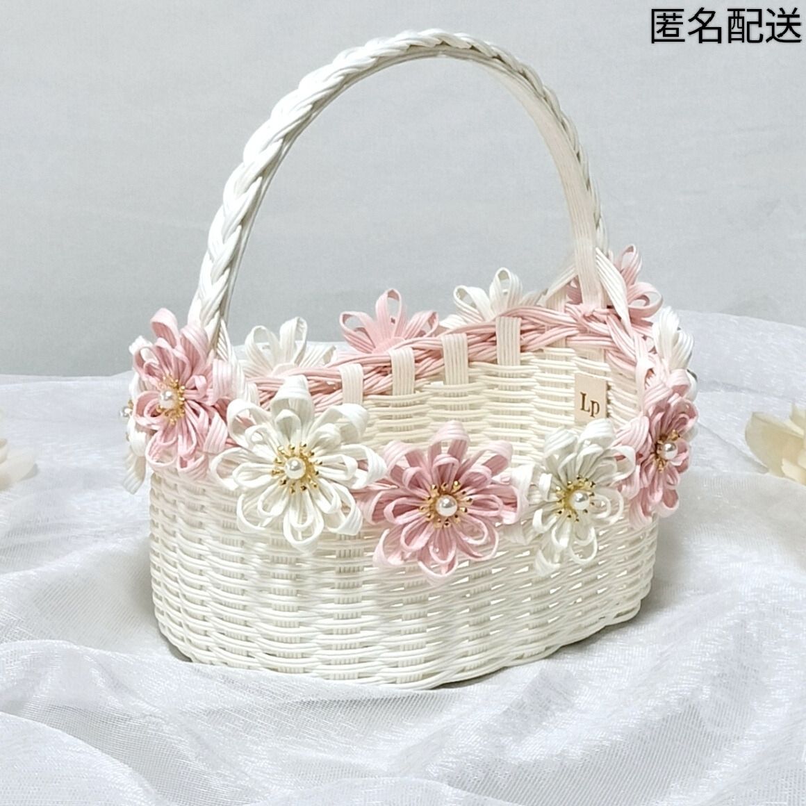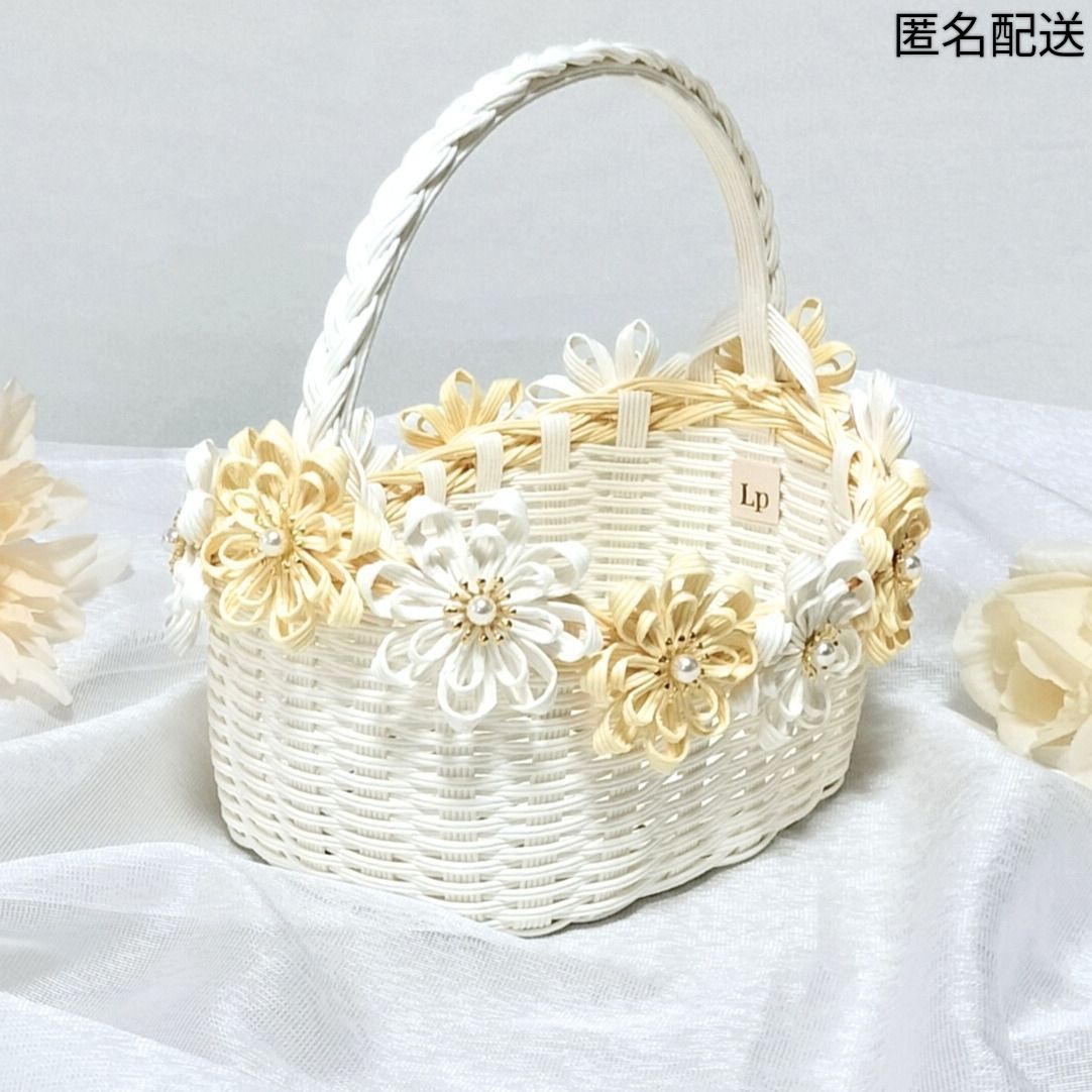 【Fleur -Grand (L) ホワイト】プチギフト入れ バスケット|結婚式 受付バスケット|ウェディング フラワーかご|手編みブライダルバスケット