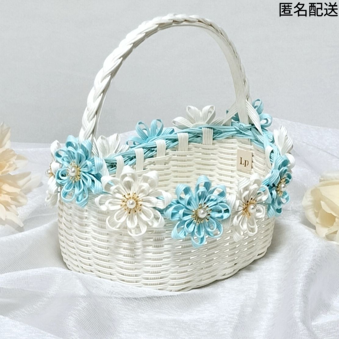 【Fleur -Petit (S) パステルブルー】フラワーガール バスケット|リングピローかご|フラワーシャワーかご|結婚式 フラワーバスケット|手編み