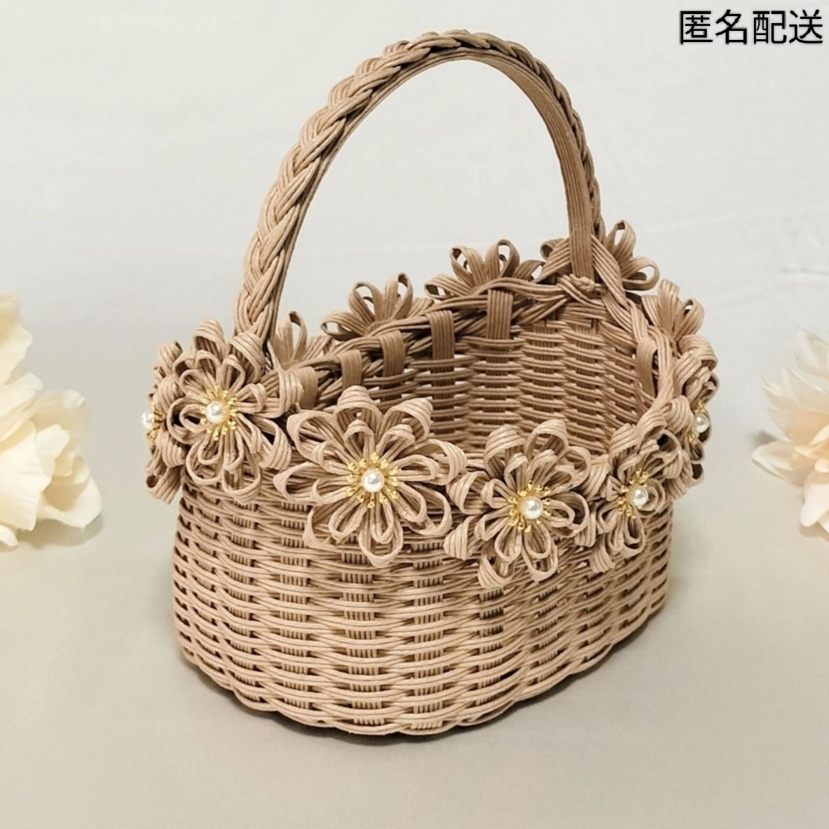 【Fleur -Petit (S) ベージュ】フラワーガール バスケット|リングピローかご|フラワーシャワーかご|結婚式 フラワーバスケット|手編み