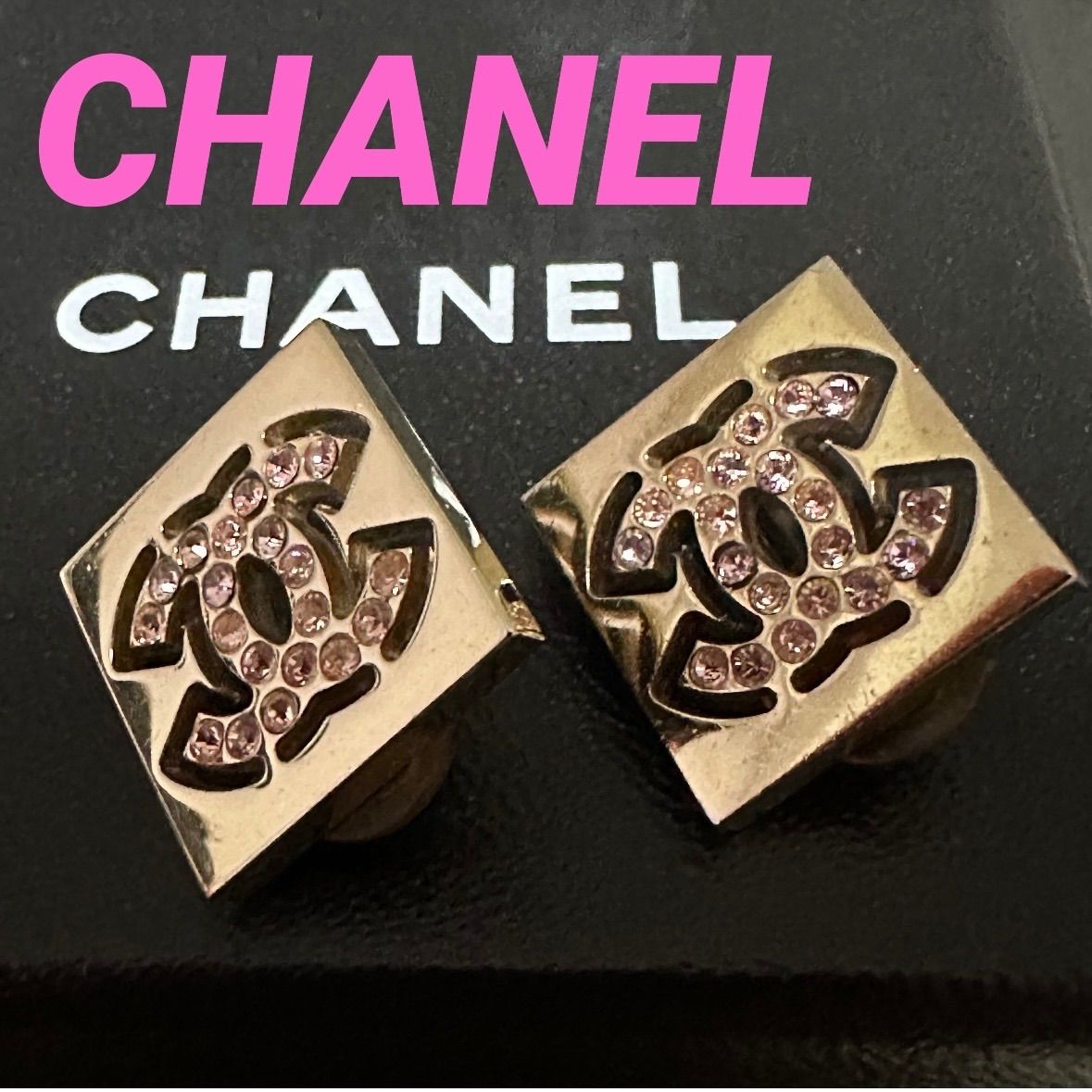 シャネル CHANEL イヤリング ココマーク 四角 ストーン ロゴ 大人気 定番 希少 メッキ ラインストーン ゴールド ピンク