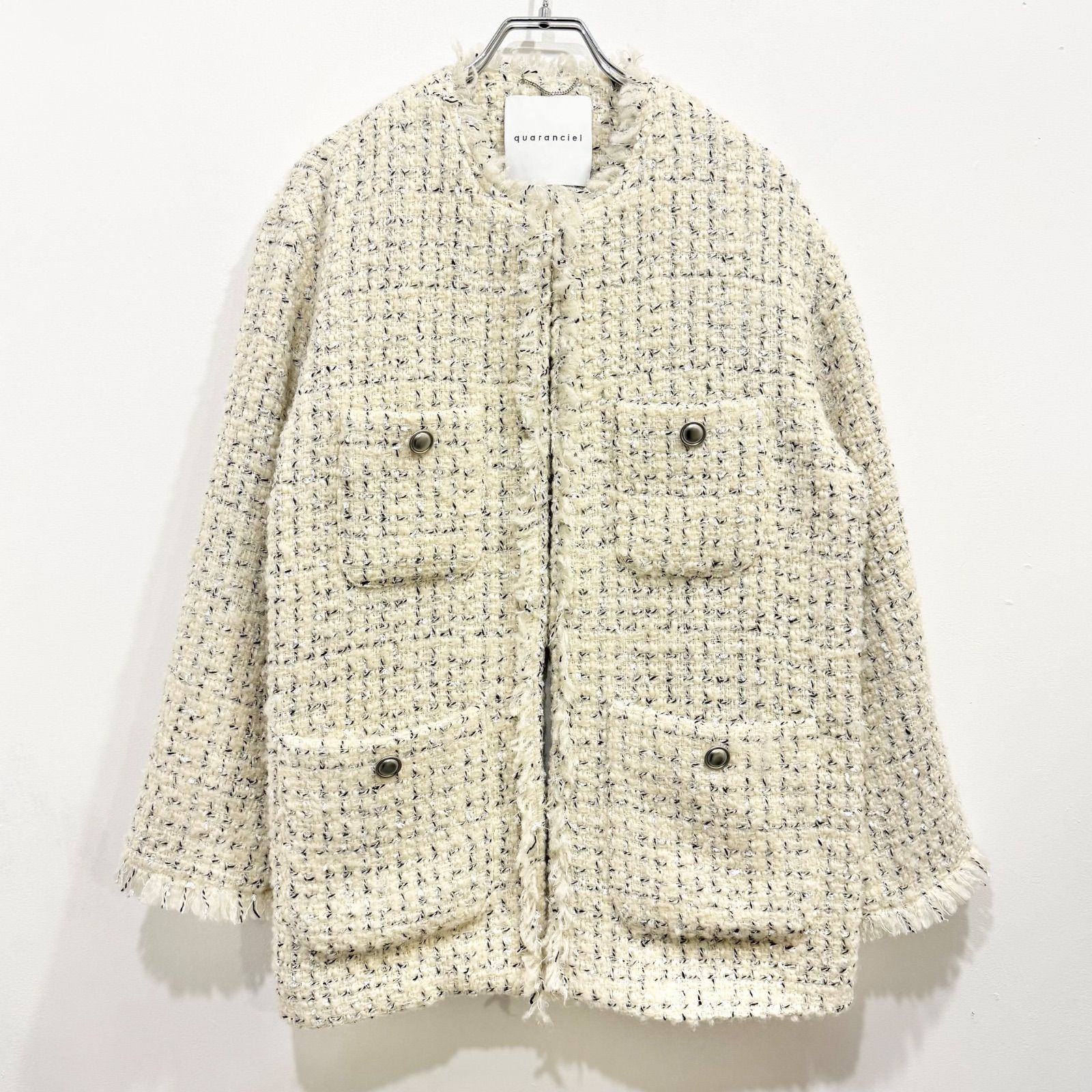 quaranciel ファンシー ツイード ノーカラー ジャケット カランシエル フリンジ オフホワイト 36【送料込み】