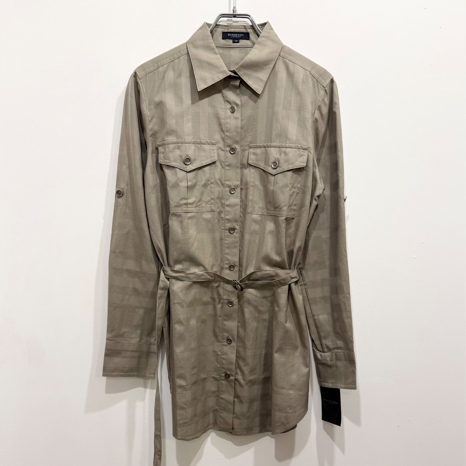 新品未使用 バーバリーロンドン チェック イタリア製生地 日本製 長袖シャツ ベージュ系 ベルト付き 40【送料込み】
