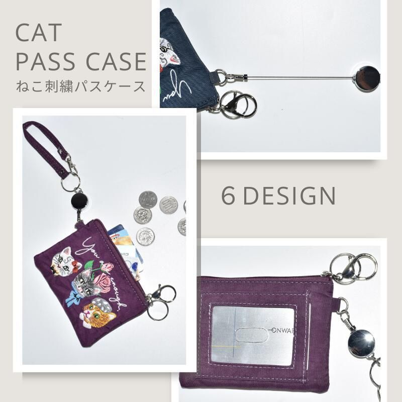 猫柄 刺繍 パスケース 定期入れ 小銭入れ リール付き 伸縮タイプ ICOCA SUICA 入れ ストラップ付 ねこ ネコ 猫 リール付きパスケース リール付き定期入れ 通学 通勤 身分証明入れ ポーチ サブポーチ