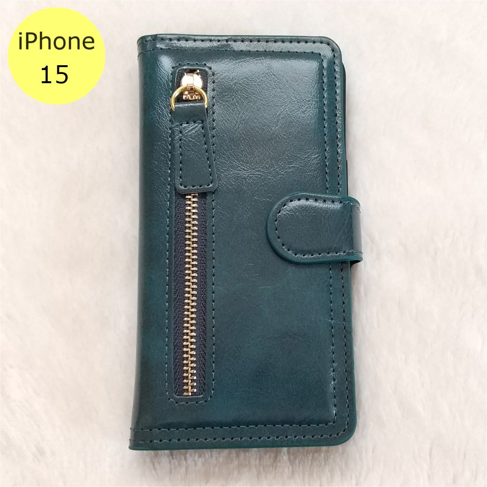 iPhoneケース 左ジッパー 手帳型 iPhone 15 グリーン スマホ アイフォン ケース