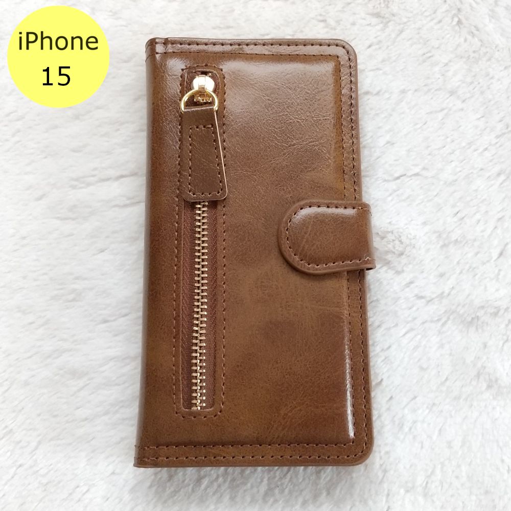 iPhoneケース 左ジッパー 手帳型 iPhone 15 ダークブラウン スマホ アイフォン ケース