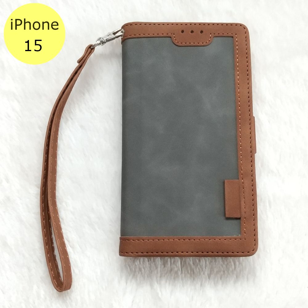 iPhoneケース レトロ 手帳型 iPhone 15 グレー スマホ アイフォン ケース
