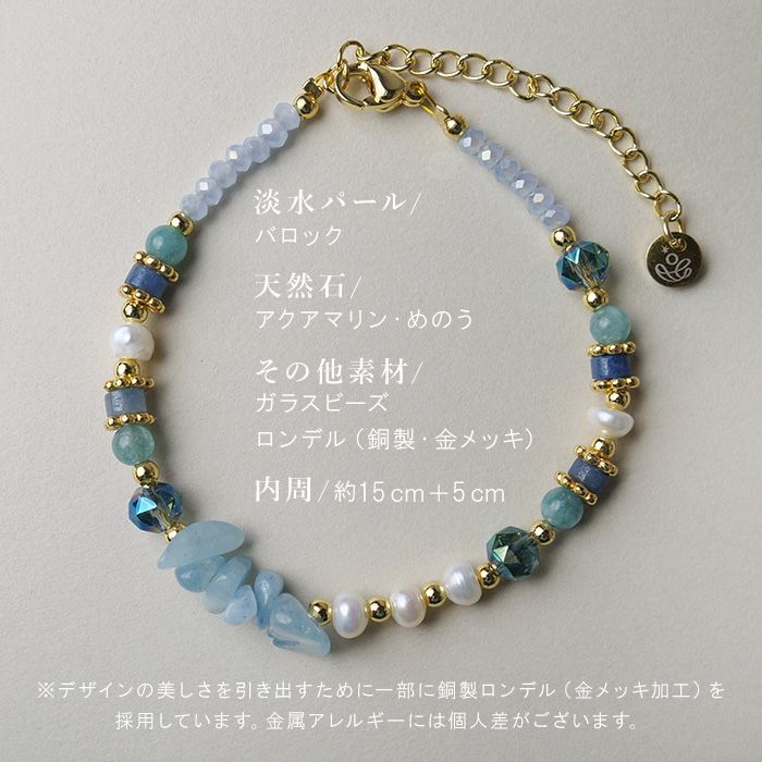 淡水パール×天然石 アクアマリン ブレスレット 留め具サージカルステンレス金属アレ配慮