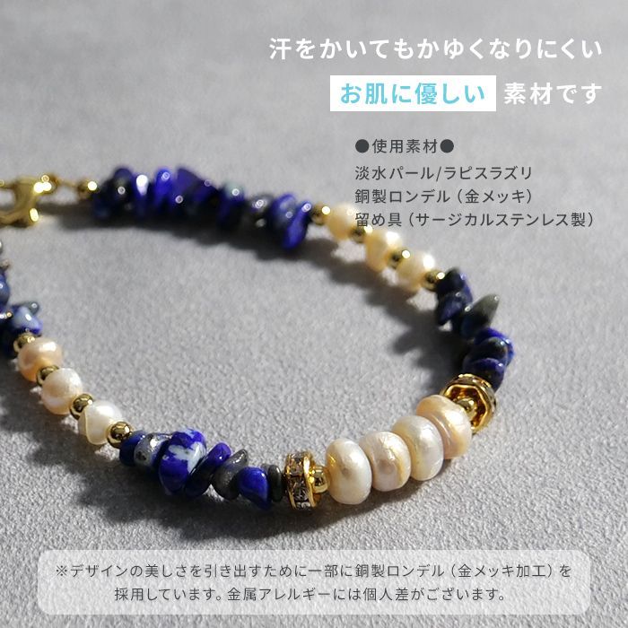 淡水パール×天然石 ラピスラズリ ブレスレット 留め具サージカルステンレス 金属アレ配慮 デザイン